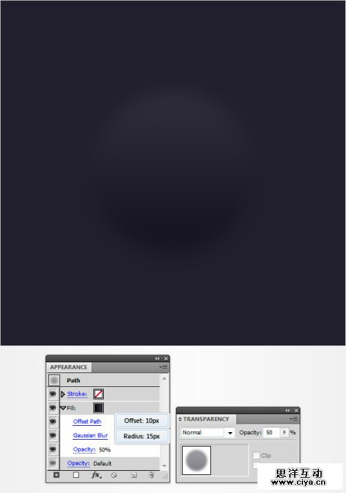 选择“mainBack”,回到外观文件,添加新填色,如图修改新填色的渐变。设置透明度15%,效果>路径>位移路径,10px位移,确定。