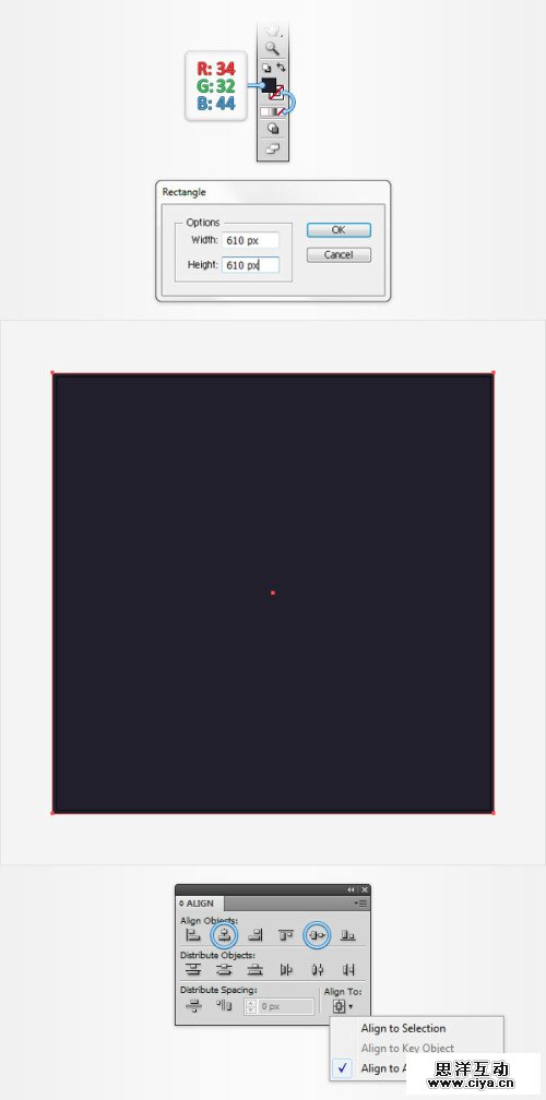 接下来你需要将这个形状居中对齐。打开对其面板(窗口>对齐),选择对齐到画板(如果找不到对齐到画板选项,在对齐面板右上角点击选择显示选项)然后垂直水平对齐。
