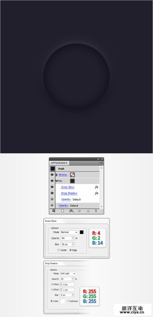 选择30像素圆,外观面板,选择填充层,效果>风格化>内发光,输入如下图所示的参数。再次添加阴影。参数如下。再一次添加阴影。然后第三次添加。