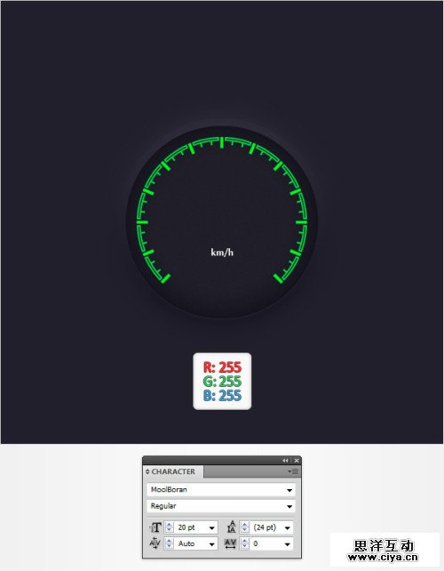 文字工具,打上”km/h”使用“MoolBoran”字体,大小20pt