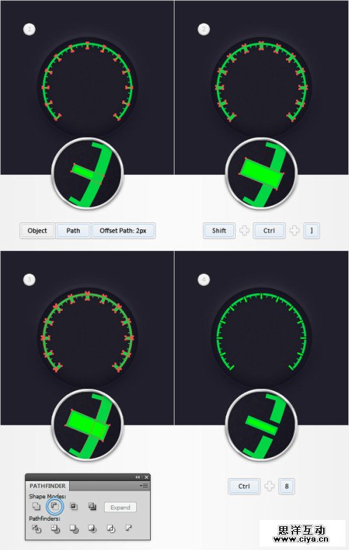 选择剩下的十三个厚刻度,在路径查找器面板点击联集,Ctrl+8.更名此图层为“thickLines”