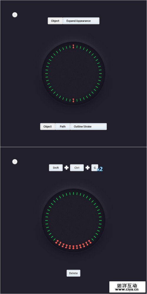 重新选择这个组合。对象>扩展>外观,对象>路径>外描边,然后Shift+Ctrl+G两次撤销组合。使用选择工具,如图所示选择高亮的三个形状,删除它们。