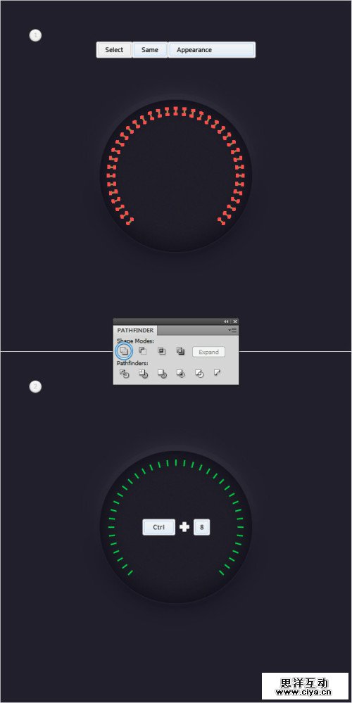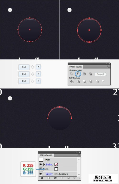 再次选择30像素圆,复制两份(Ctrl+C>Ctrl+F>Ctrl+F).选择最上一层,下移1像素.选择两个副本,路径查找器>减去前面,填充结果路径为白色降低不透明度25%,混合模式柔光。