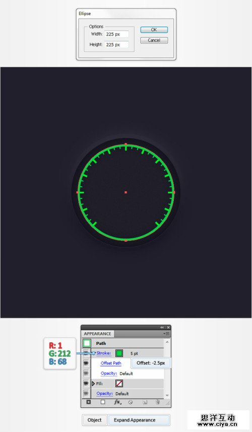 影藏网格,撤销对齐到网格选项。使用椭圆工具,画一个225px大小的圆,垂直水平居中。外观面板,填充色为无,添加5pt的描边,颜色为(1,212,68).效果>路径>偏移路径,输入值-2.5px.对象>扩展>外观。