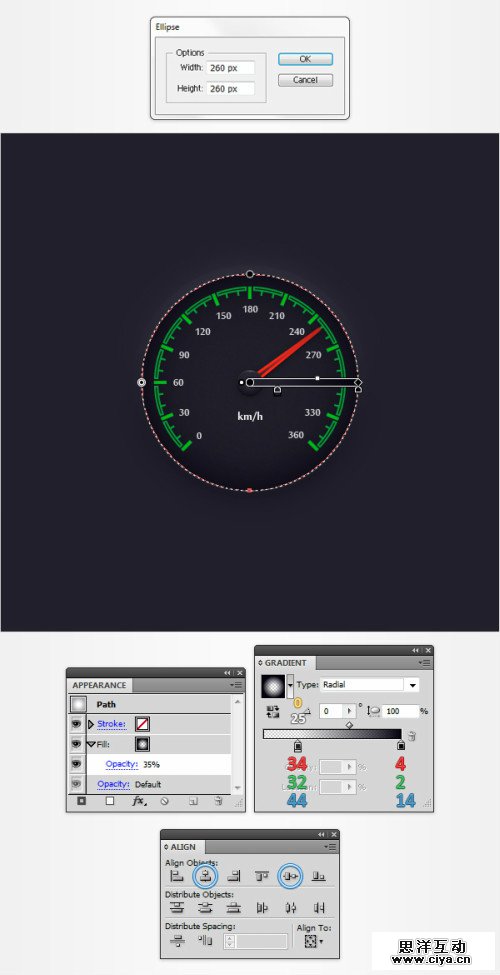 选择椭圆工具在画板上单击,打开椭圆窗口。创建直径260px的椭圆。