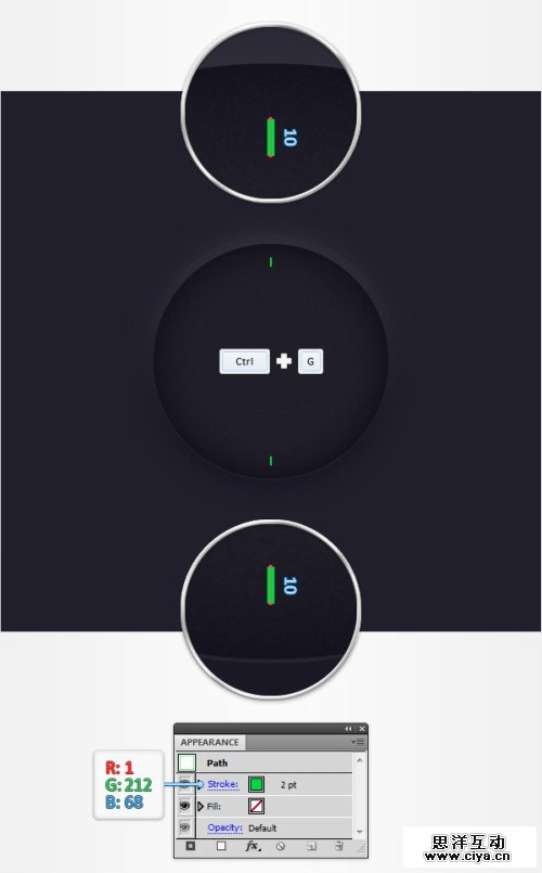 钢笔工具,创建两个垂直的10px的路径,如图所示放置。对齐到网格会简化你的工作。为这两个路径添加2pt的描边。设置颜色(1,212,68)。选择两个路径,Ctrl+G组合他们。