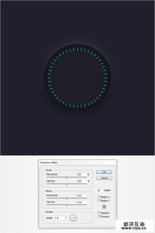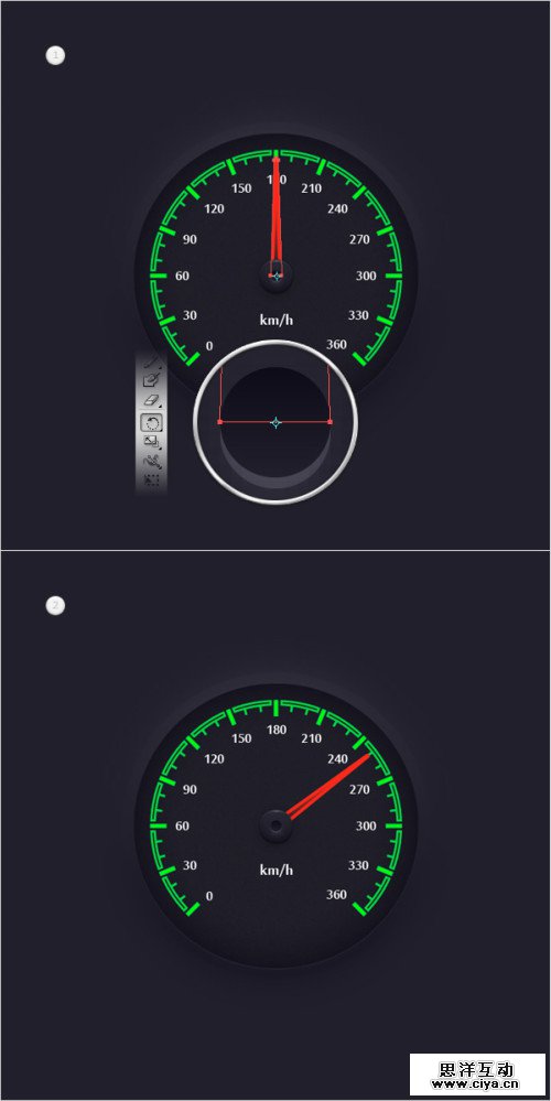 使用椭圆工具创建一个30px的圆。为他添加一个如下图所示的渐变。处置水平居中。
