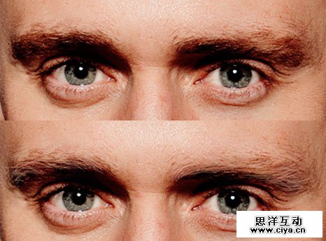 我们用仿制图章工具在抖森的发际线附近取样,覆盖掉一些发根部分的头发。这样可以达到发际线后移的效果;再用直径1像素的画笔在眉毛附近取皮肤的颜色,在眉毛里面绘制相应的毛发形状,造成毛发稀疏的假象。
