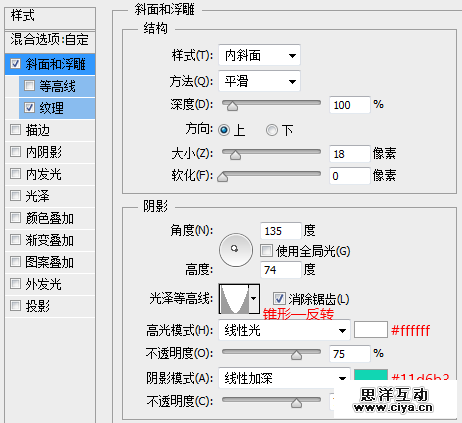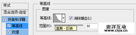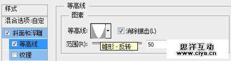 勾选“等高线”选项,等高线设置为“锥形—反转”,记得勾选“消除锯齿”选项。