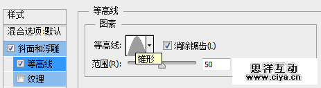 勾选等高线,同样这里的等高线设置也是“锥形”,记得勾选“消除锯齿”。