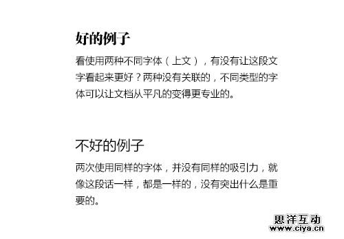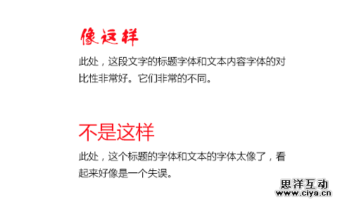 使用两种字体是很好的,但是使用两种太相近的字体就很糟糕了。所以选择两种来自不同字体类型的字体。有衬线的字体(像Times New Roman),没有衬线的字体(像Arial),手写(看起来是像手写的)或者是具有装饰性的。确保字体看起来与众不同。