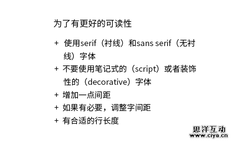 可读性就是怎样让一大段的文本容易阅读,字体大小,字体形状,字间距,行间距,一行的长度都会影响可读性。