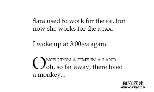 小型大写字母,类似于所有的大写字母,当文本中有一大段大写字母,可读性很难。然而,小型字母应该被用在缩写中,以便于不投放更多的注意在小型字母上,当然,使用小型字母在AM和PM中。你也可以在文章章节的第一行第一个字母使用大写,仅仅是为了视觉爱好。