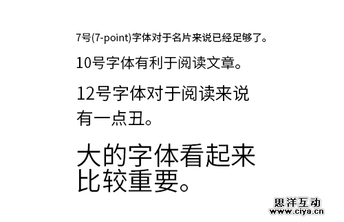 因为12号字体是文本处理软件至今为止默认的字体,我们中大部分开始都认为12号字体是最适合阅读的字体。但是我们的眼睛确实可以阅读更小的字体,在大多数文档中10号字体看起来跟适合。在名片中你甚至可以降到7号或是8号字体。当然,标题需要比文本更大的字体,在文档中比较重要的事字体应该更大。