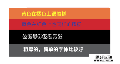 文字背景填充,是指使用颜色明度高的文本在一个深色背景上,或者相反。背景填充比较适用标题和开头。如果你使用背景填充,确保有文本与背景有高对比度的颜色。不要在红色上使用蓝色,不要使用狭窄的或是有奇特特征的文字,要使用圆润、比较规整的字体。