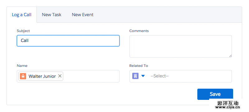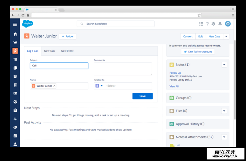 在这个案例中,这个Lead 表单是关于一个名叫Walter Junior的人,并且这是执行一次调用之后显示的界面。这个用户相关的信息包含了四个字段,而其中“姓名”和“项目”两个字段都被预先填写,由于这是一个调用信息的界面,所以项目中默认填写的是“Call”,而相关用户的名字也无需填写,直接填写进去了。