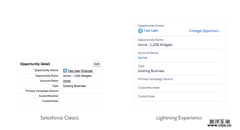 在Lightning 中,表单里的标签和它所对应的输入字段是一起左对齐的,并且标签处于输入框的上方。这种设计方式可以让用户操作更加省心高效,和之前的版本相比,用户在浏览和操作的时候,只需要进行上下眼动就可以搞定一切,无需左右扫视。