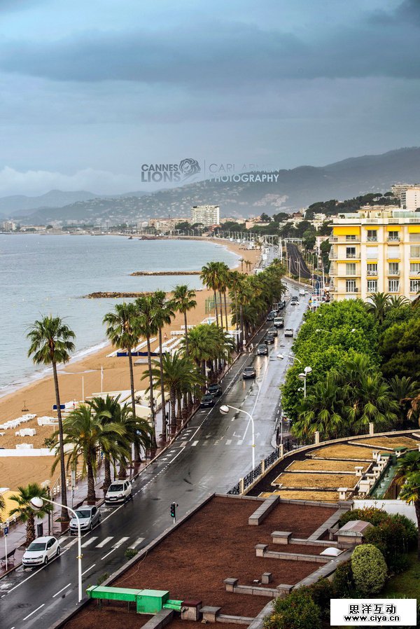 参加戛纳广告节时的照片,个人信息的文字采用了广告节logo同样的字体,把logo融入到远山雾色中。