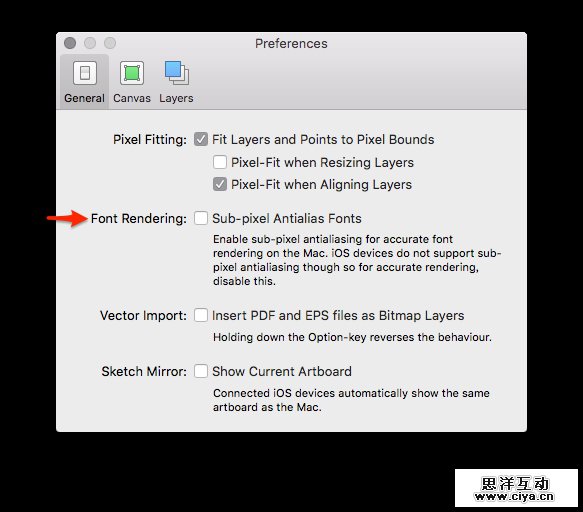 2. Sketch因为使用的是 Mac 默认的渲染方式,所以不需要选择,但是对与中文却有问题,如下图(上),解决方案就是:打开Perferences → General 去掉 Font Rendering的勾选就正常了。