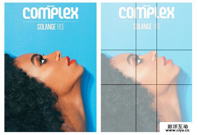 这个案例是Complex杂志的封面,整体布局符合黄金比例,而黄金比例三分法下的两个交点上则正好和女性的鼻子与眼睛上。