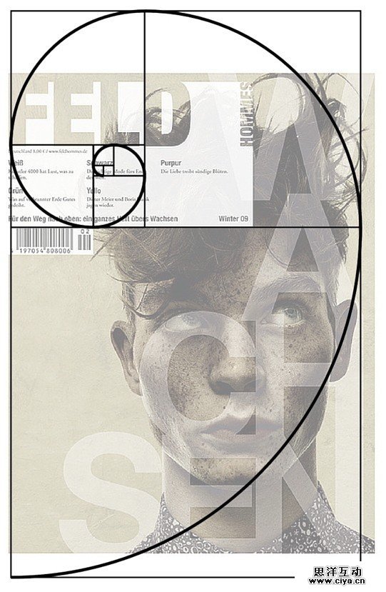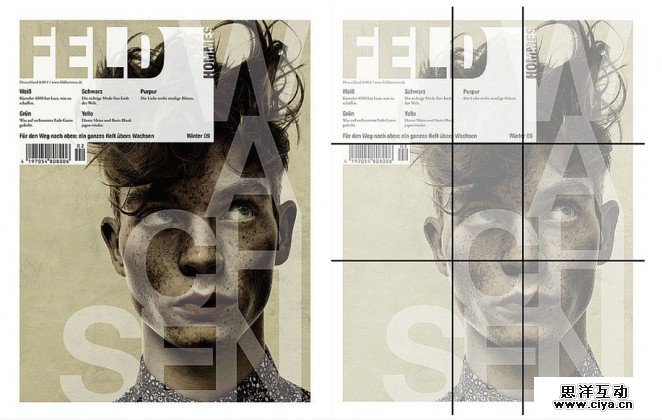Feld杂志的设计,也参考了黄金比例三分法,左上方的标题和内容区块明显是参考分割线来设计的,而右下方的背景中的人物的鼻子——也就是人物的中心点正好压在右下方的交点上。