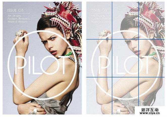 Jason Mildren 为Pilot 杂志设计封面,其中的布局采用的是均匀三分法来构建视觉重心,图中模特的眼、拇指和手臂轴心都处在视觉重心上,人物位置靠右下,留白靠左上,又是一个平衡的布局。