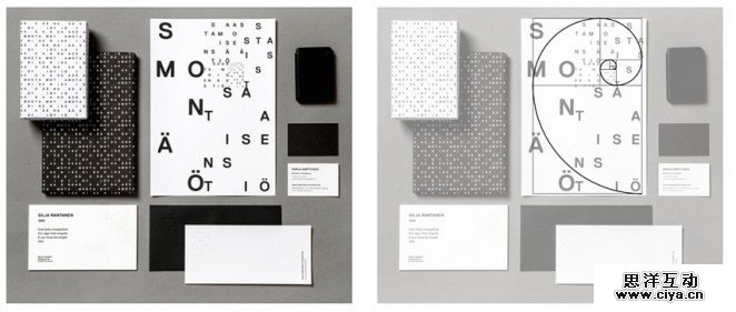 Saastamoisen säätiö 的这个视觉设计稿就更典型了。图中的字母分布看起来乱中有序,它们就是沿着黄金螺旋来分布的,并且随着螺旋半径的缩小而逐渐缩减字体尺寸,并且提升字母的密度。这样的设计保证了视觉的平衡,富有设计感而不混乱。