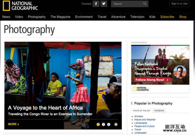 这种两栏式布局在网页上非常实用,我们所熟知的美国国家地理的网页就是使用的这样的布局方式,看起来可读性非常不错,比例平衡,符合网站内容自然的特性。