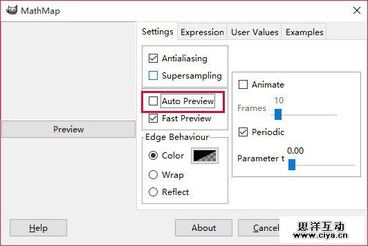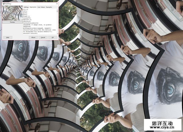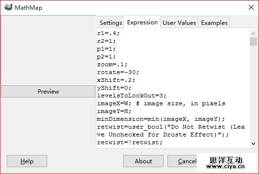 之后进入Expression界面,将原有的默认代码删除,粘贴上Droste Effect代码,点击预览(Preview)按钮(记住不要将顺序搞错了,不然会卡住!!!)