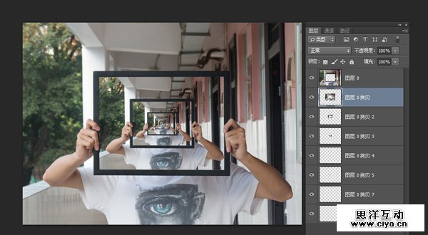 3. 接下里就是就是最重要的操作,在副本图层上按下Ctrl+Alt+Shift+T(再次变换复制),在空白的区域就又出现了一张图像,重复再次变换复制的动作,就可以一直循环下去,调整一下图层,可以得到以下这种效果。