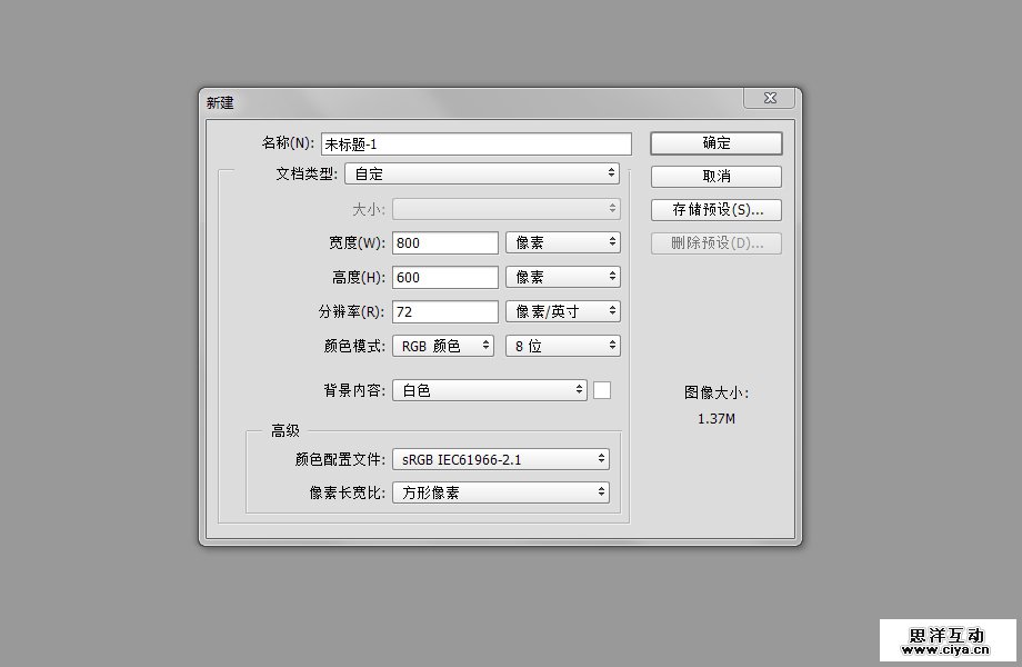 打开PS,新建一个宽800px高600px的新文档,如果只用于网页上浏览无需打印则将分辨率设置为72。