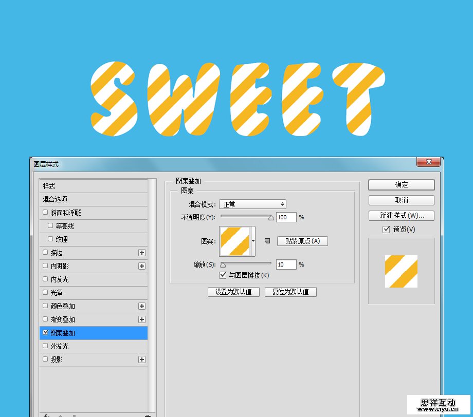 给图层应用图案叠加。对了,就是让我们的白色文字铺上斜纹图案。这一步比较简单。大家可以看到我把缩放调整到10%,这意味着这一功能可以缩放图案的大小。