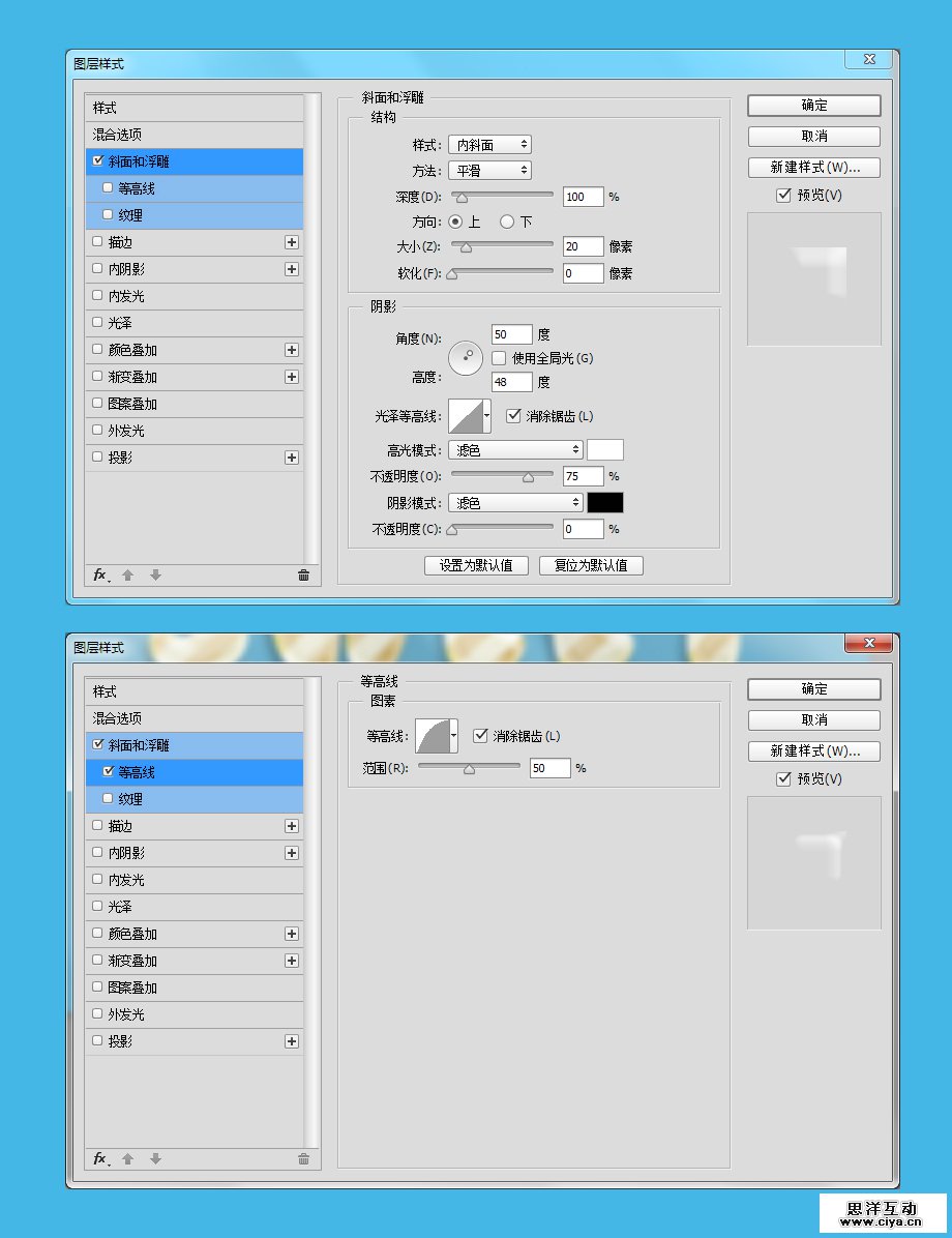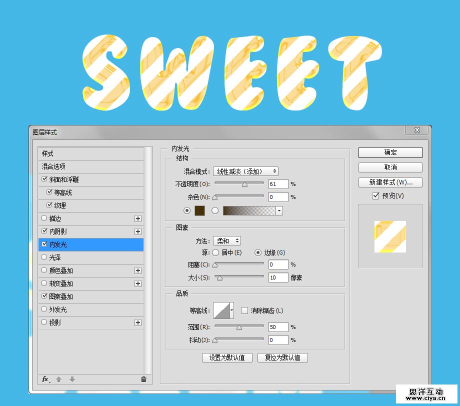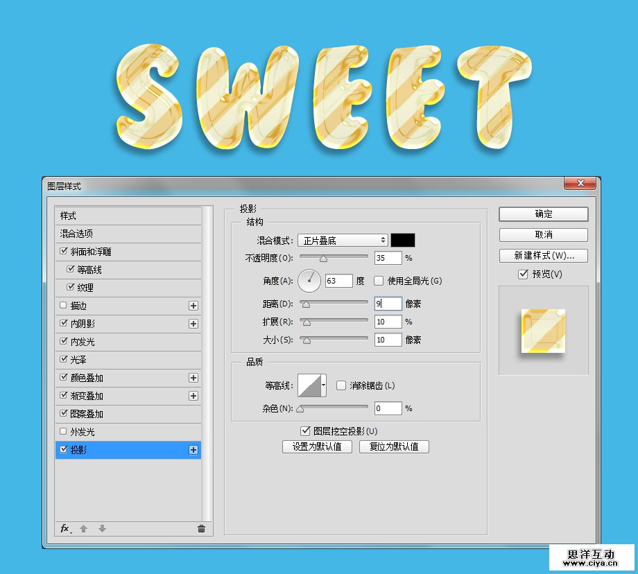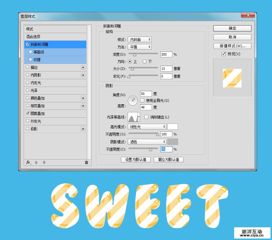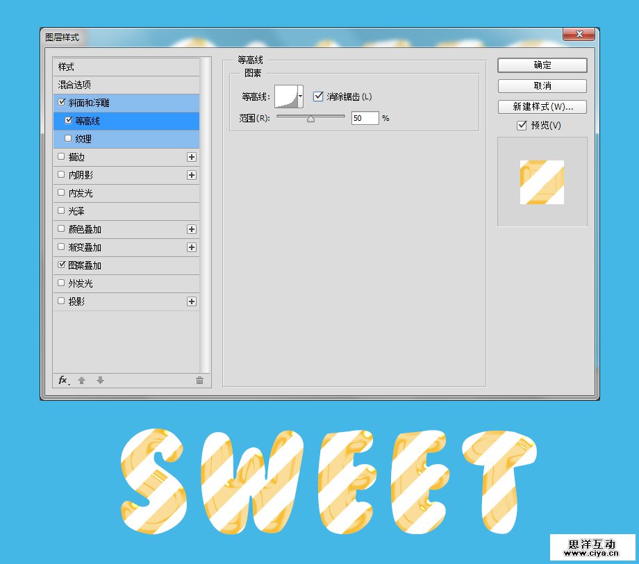 还记得我们的复制层吗?填充虽然被降低为0,但给它添加图层样式依然有效。这时,我们打开“sweet”的复制层的图层样式中的“斜面与浮雕”,为文字添加高光。而与此同时等高线变为弧形,增添了文字表面高光的圆润感。