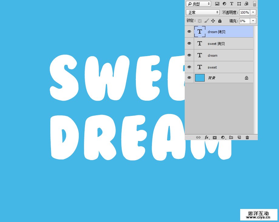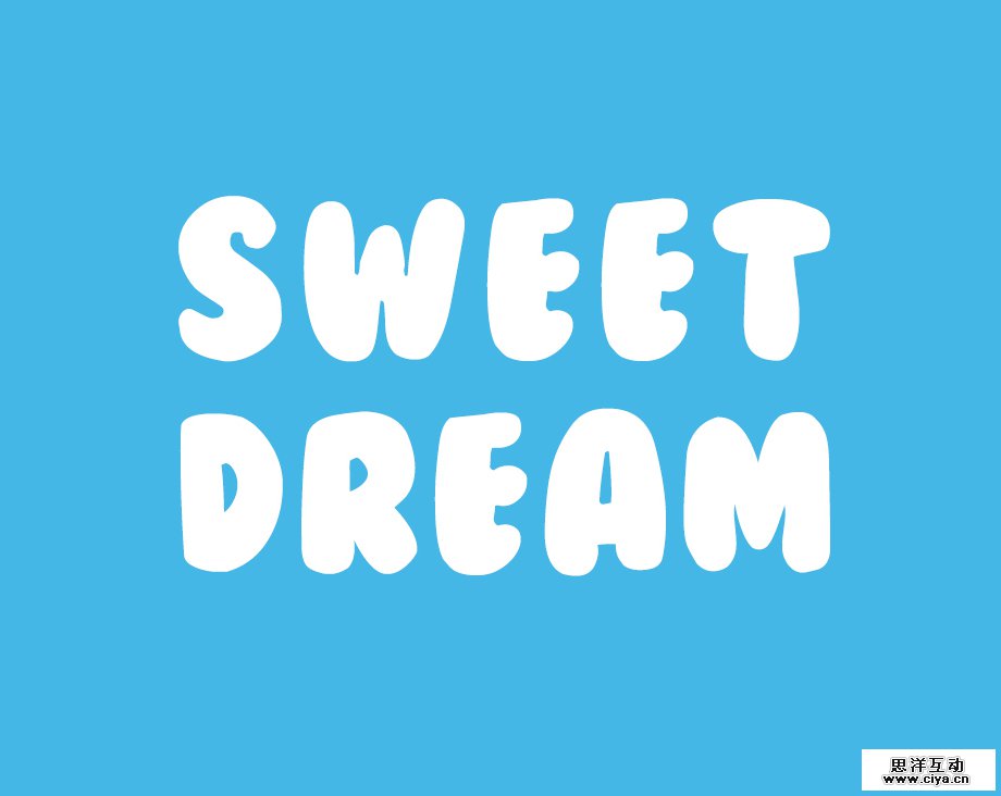可以将背景填充蓝色背景。其实背景色只是为了接下来创建文字的需要。这时,可以在画布中央用BubbleGum字体写上你的文字,例如我在这里写的“sweet dream”,当然这是为了应景。
