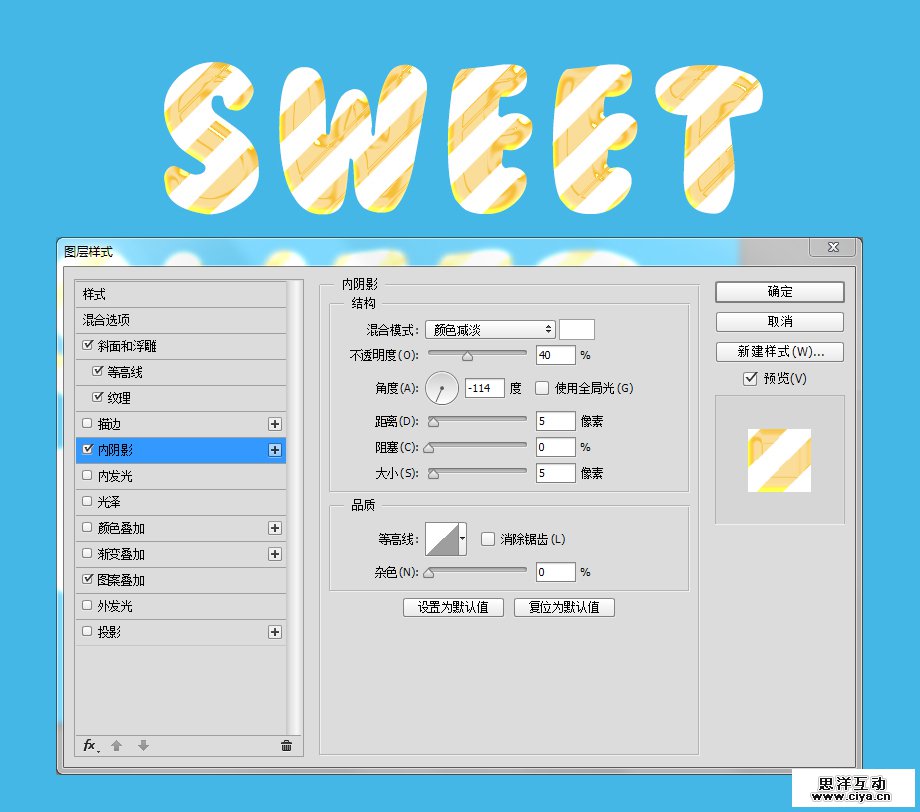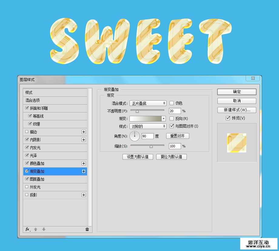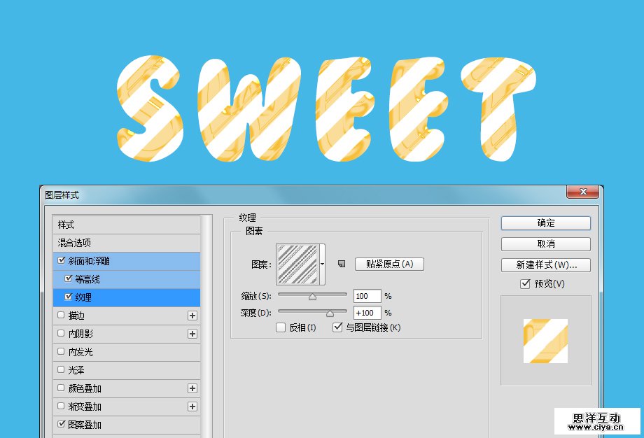 关于糖果文字的字体,并不十分局限。我个人推荐的使用圆圆胖胖的英文字母,看上去有可爱感,比如我在这里使用的BubbleGum Regular。纹理的使用,我采用了斜纹,你也可以使用其他的纹理。在我的收藏夹—纹理中你可以找到各大免费纹理下载的网站,去寻找适合字体的纹理。我个人的感觉是英文比中文更适合此类风格,中文由于结构比英文更为复杂,会显得整体线条不够明朗,所以如果内容是中文的,谨慎之!