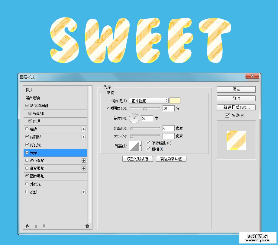 给文字的整体添加上“光泽”效果,这里需要注意的是光泽的色系也需和黄色搭配,为一种浅黄色。设置角度的时候牢记住自己的虚拟光源的位置。