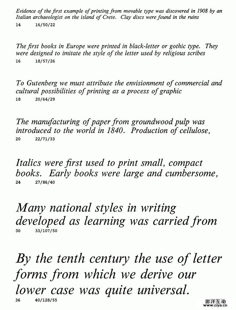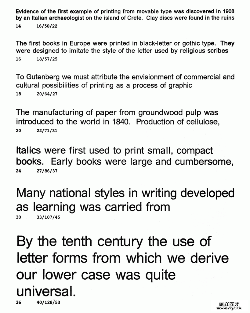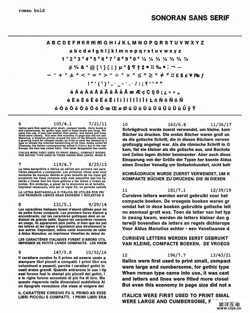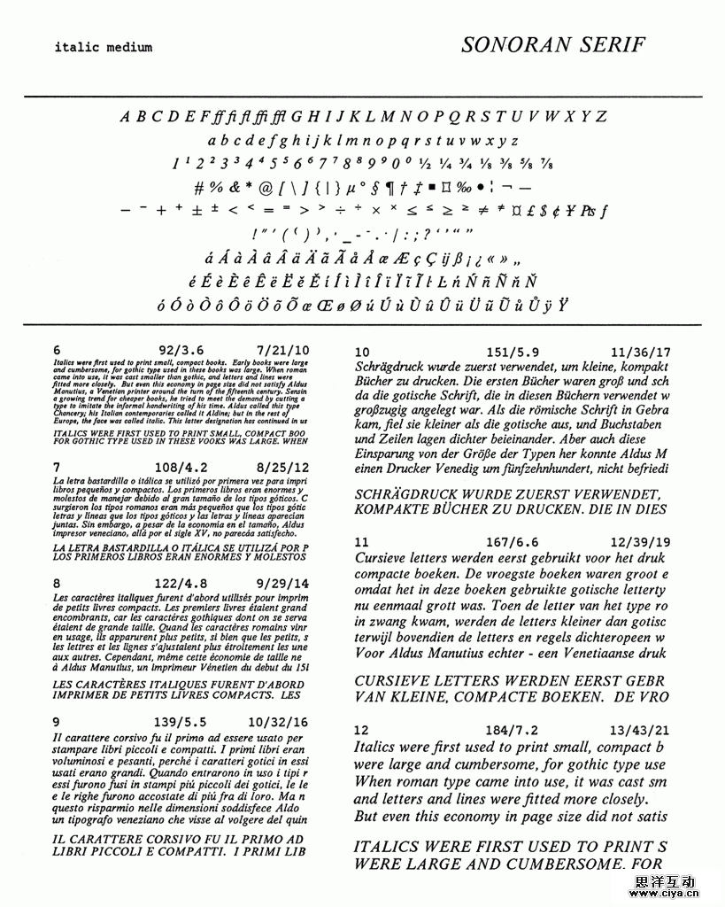 Serif 与 Sans 一样,在不同的文字尺寸,设计都有大幅的差异,而 Serif 又特别明显。在较小的尺寸,字间取得比较宽,线条比较没有对比,x-height 比较高,即使是 6pt 也可以清晰阅读(以前没看过这种造型的 Times New Roman,非常新鲜)。