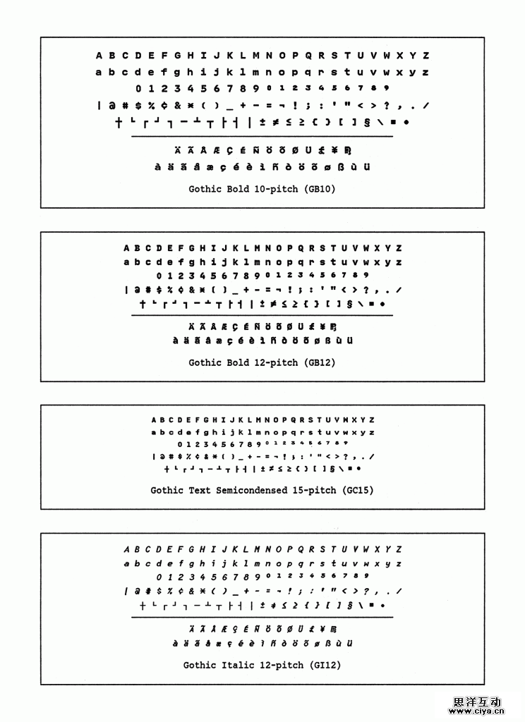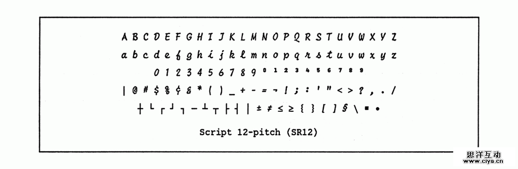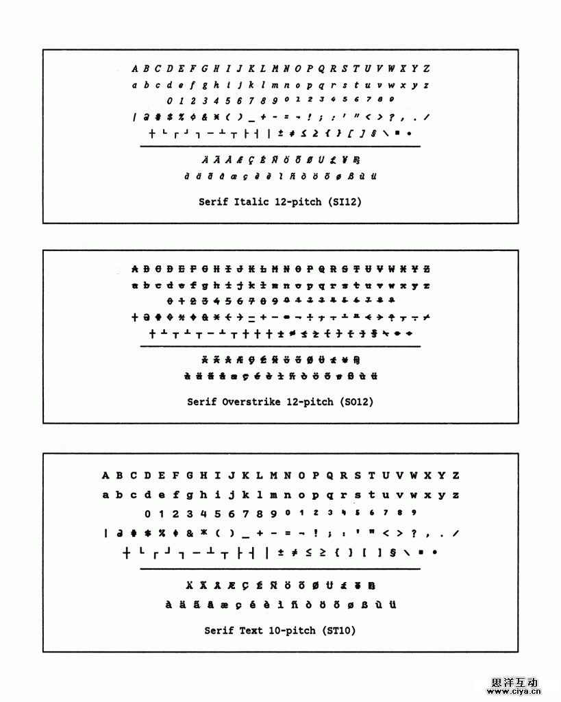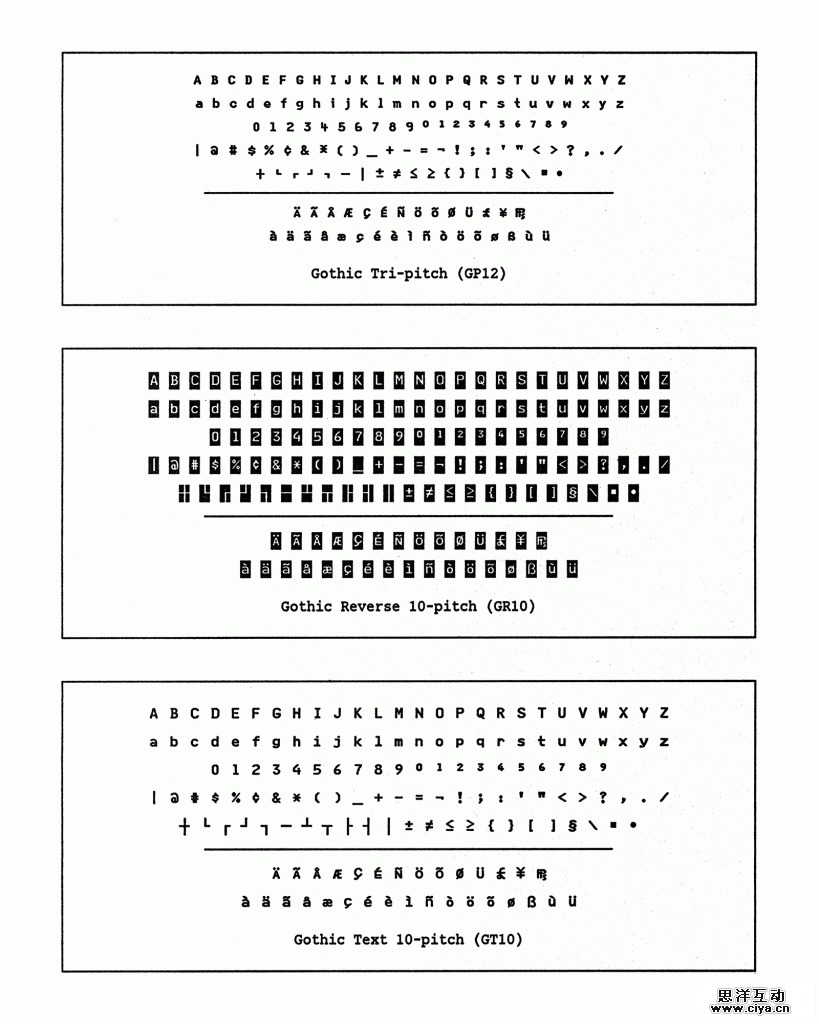 另外,3800-3 还内建了其他的字体(很可能是 IBM 自制的)。为了在等宽字的空间里塞进比塞塔货币符号(Pts)而把 P 与 t 合体的设计等等,看得到很多设计上的苦心。Ç と ç 为了放得下软音符,有把字稍微抬高。另外 Script 的设计太优秀了,以等宽字来说算是做得非常漂亮的。好想看到这些字的点阵资料……