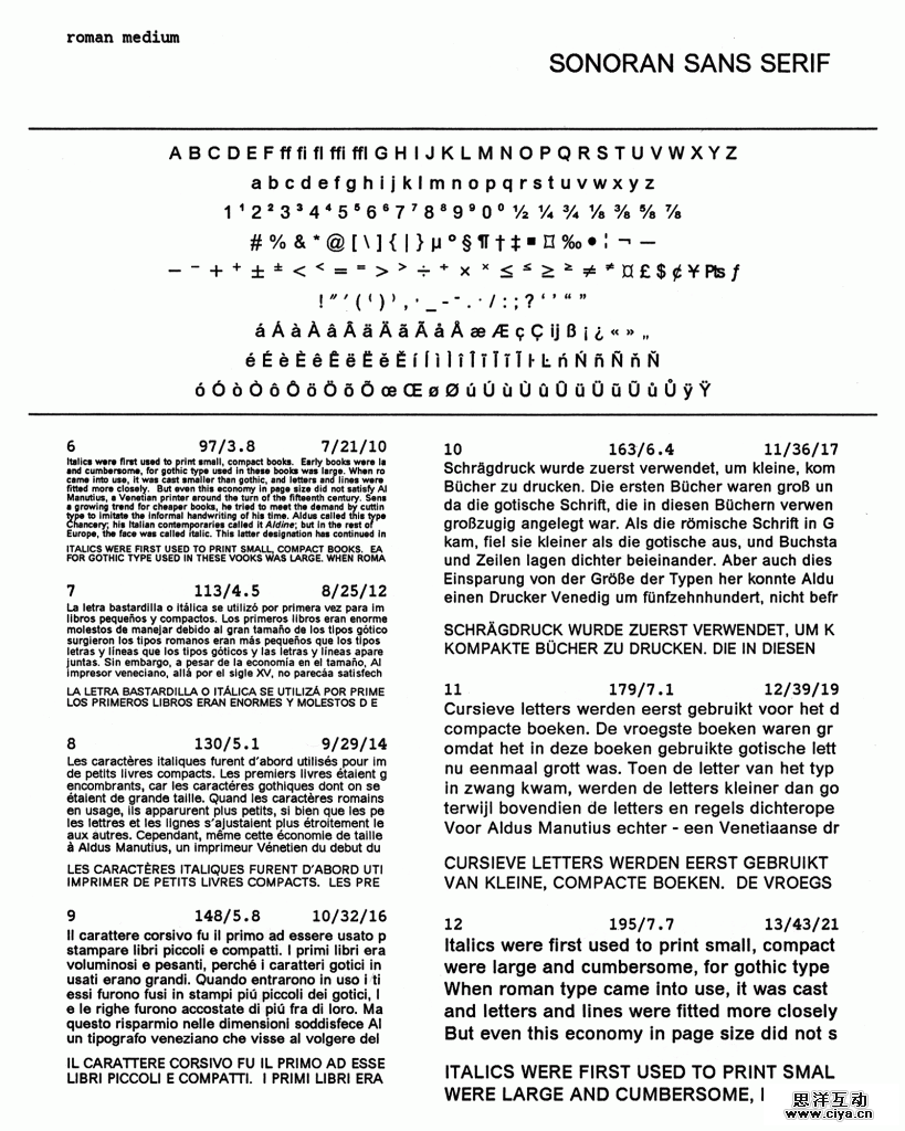 - Sans 以 Helvetica 为基础,但因为不是 Monotype 的字体,所以提供设计有稍微差异的新字体。