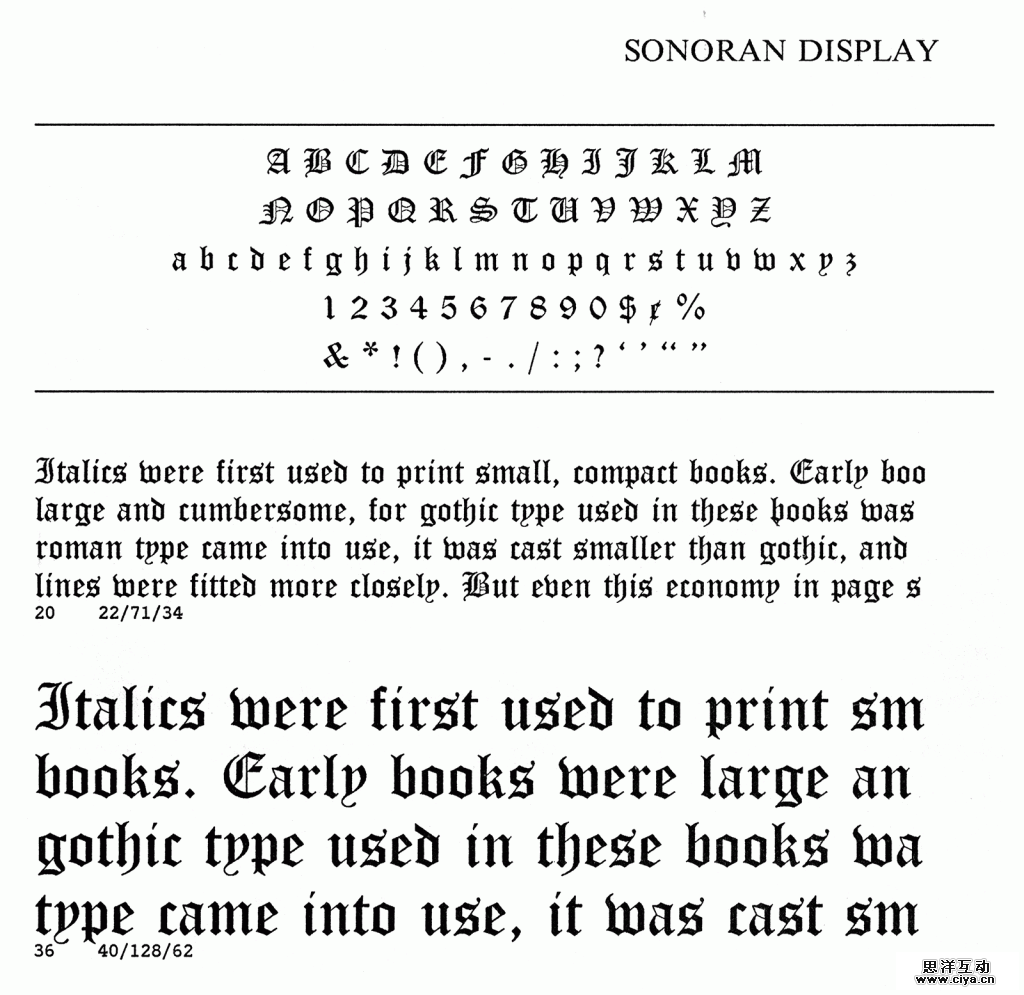 IBM 3800-3 的打印分辨率是 240dpi,所以 12pt 的点阵字,高度就有 40 像素 (包括音调记号的空间)。最小尺寸的 Sonoran Petite 只有 4pt,所以只有 14 像素高(于是 Petite 并没有包含音调记号)。