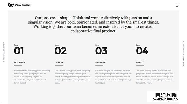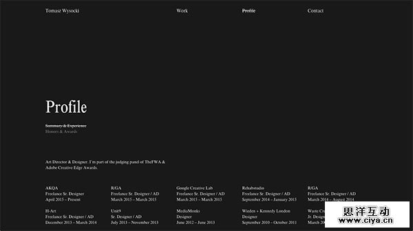 Visual Soldiers 和 Tomasz Wysocki 的网站都是这样,优雅而干练的色调是它们的基因。简练的布局和独特的品牌定位,使得它们无需鲜艳的色彩来呈现CTA按钮和边角的菜单,安静的白与黑就足够了。