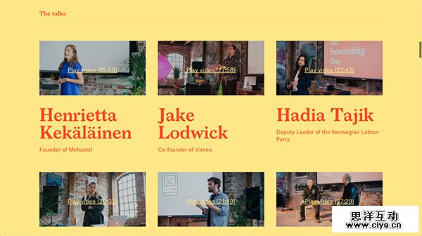 An interesting Day 是为一个“在奥斯陆峡湾的小岛上上为期一天的奇怪小型会议”而设计的网站。黄色背景上用红色文字的网站并不多见,配合着个性十足的图片,整个网站所有的设计元素都是在为你阐明“奇怪”的特色。