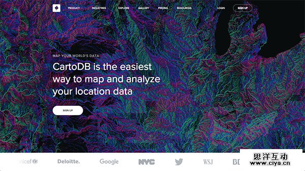 CartoDB 是一款可以将位置数据可视化的有趣APP,那么有什么能比真实的地图来的更加直观美丽呢?所以它出现在网站首页,用最视觉化的方式来呈现自己的产品,让色彩为产品代言。
