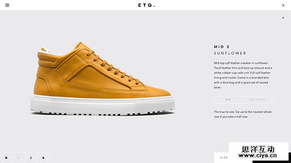 说道让产品,ETQ也同样让产品优先级压过UI,极简的网站设计风格之下,配色方案显然是延续自产品配色。设计师让产品本身成为视觉重心,尽管不是所有的鞋子都是五颜六色,但依然尽量让配色兼容尽量多的产品,这也是真正意义上的以产品为中心。