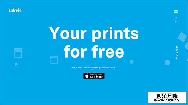 Takeit 的页面设计同样如此,整屏的蓝色背景让白色的网页元素显得非常明显。白色的大标题是视觉重心,然后用户会注意到标题周围的App Store按钮,LOGO和汉堡菜单。