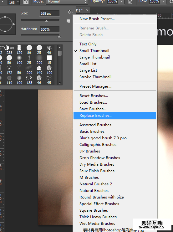 下载了云盘里的动作文件,在文件夹里有个笔刷文件,得导入到ps,注意措辞,是替换笔刷,Replace brushes,点击左上角笔刷位置,再点击右上角小小的设置图标,出现以下列表。