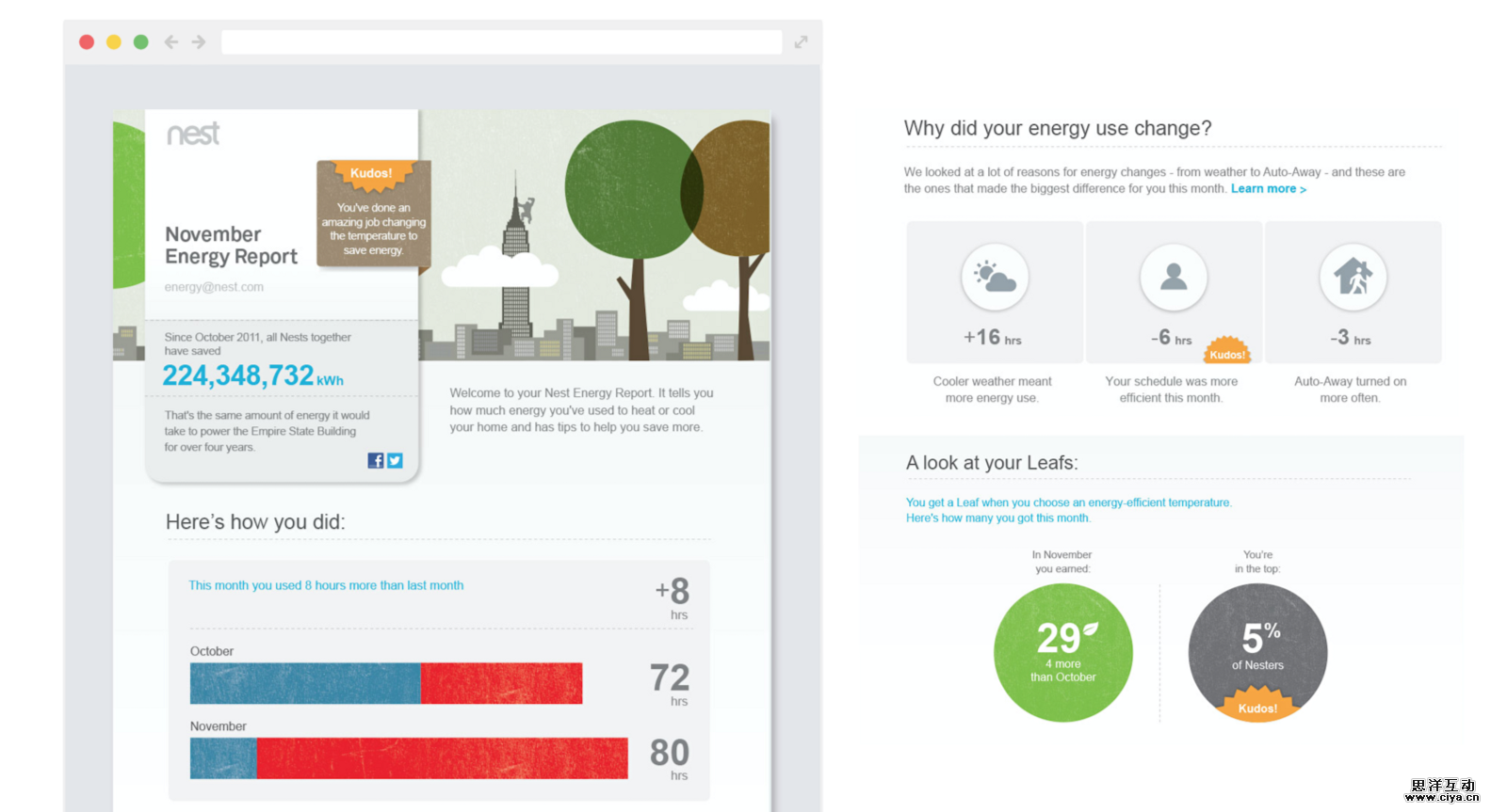 Nest发送给用户的每月报告会展示用户的能源消耗,对于不会每天设置温控器的用户来说,这些有代入感的信息图有效的展示了Nest是怎样帮助他们节省能源和节省开支的;类似“叶子”和“荣誉徽章”也能唤起用户内在的竞争意识。
