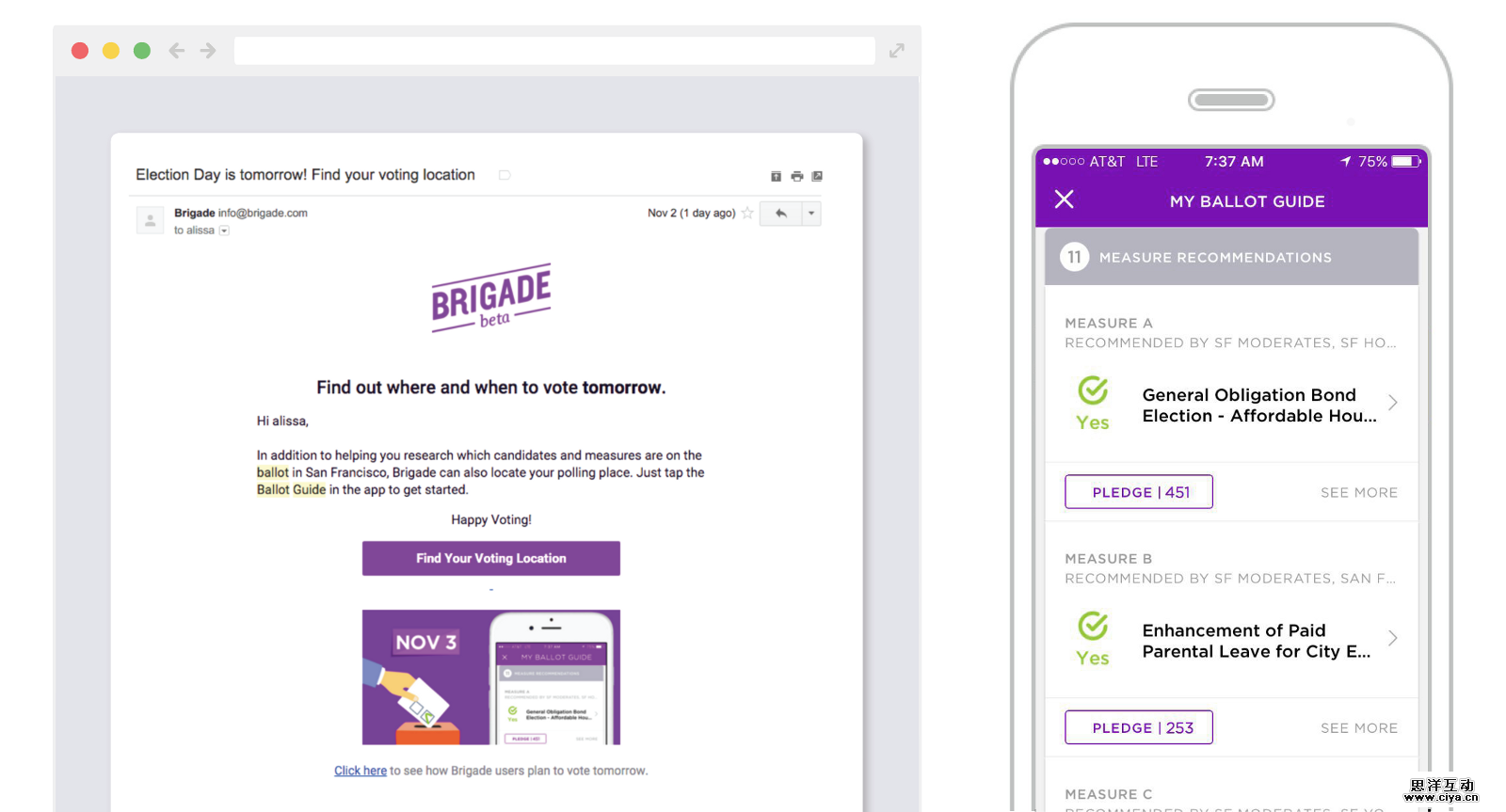 Brigade,一个鼓励人们就新闻和政治事件发表看法的创业公司,最近他们设计了几个帮助投票选举的工具,在选举前一天,这款app帮助人们找到当地的投票站,并且让用户回答一些基于政治事件的问题,并根据用户的答案而给出投票建议。