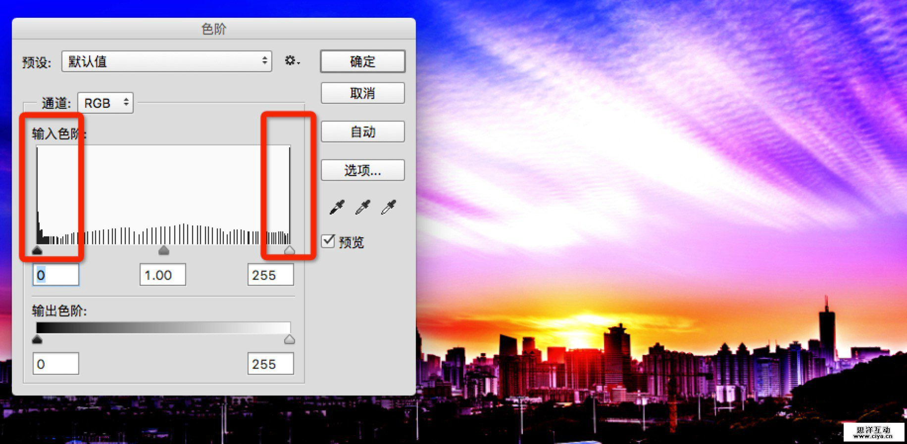 我再举一个极端的例子,我把照片的对比度调到很高,就会发现色阶的两侧都出现了溢出。