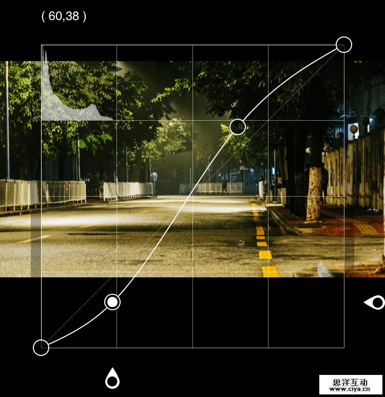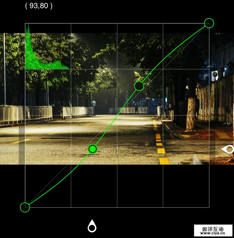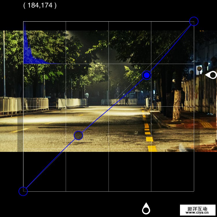调节曲线后背景的照片可以实时预览,这点还是不错的,十六宫格左上角有个色阶图简单提示了图片的信息,这里我不做详细展开,只简单介绍下,色阶左侧是黑(暗)右侧是白,一张曝光均衡的照片它的色阶应该是比较均匀的,如果画面欠曝,或者出现死黑现象,色阶的左侧就会很多或溢出,反之如果过曝,色阶右侧就会就较多信息。